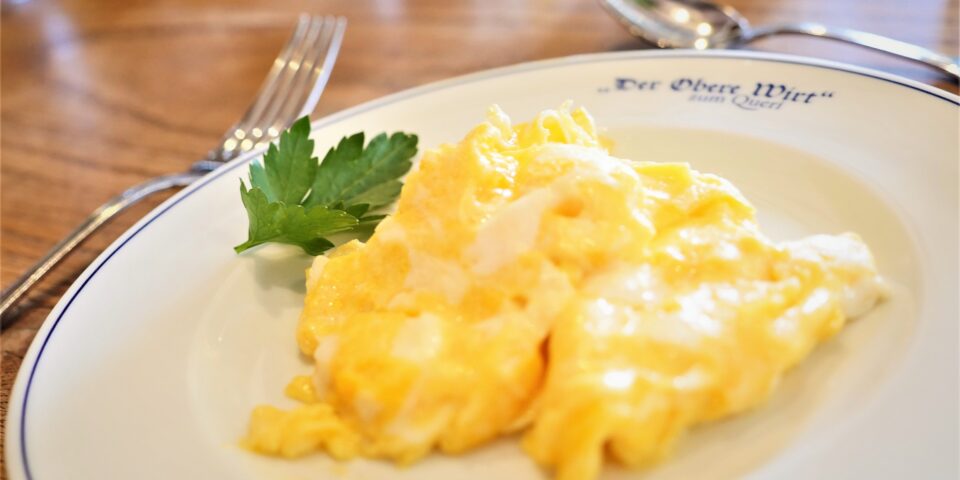 In unserer Küche bereiten wir Ihnen frische Eierspeisen wie Rührei oder Spiegelei, wir werden Sie am Tisch danach fragen.